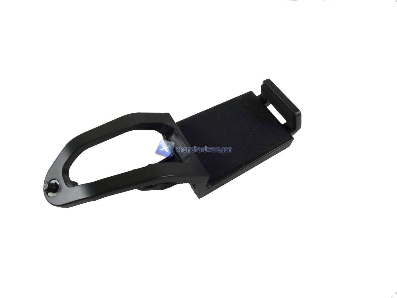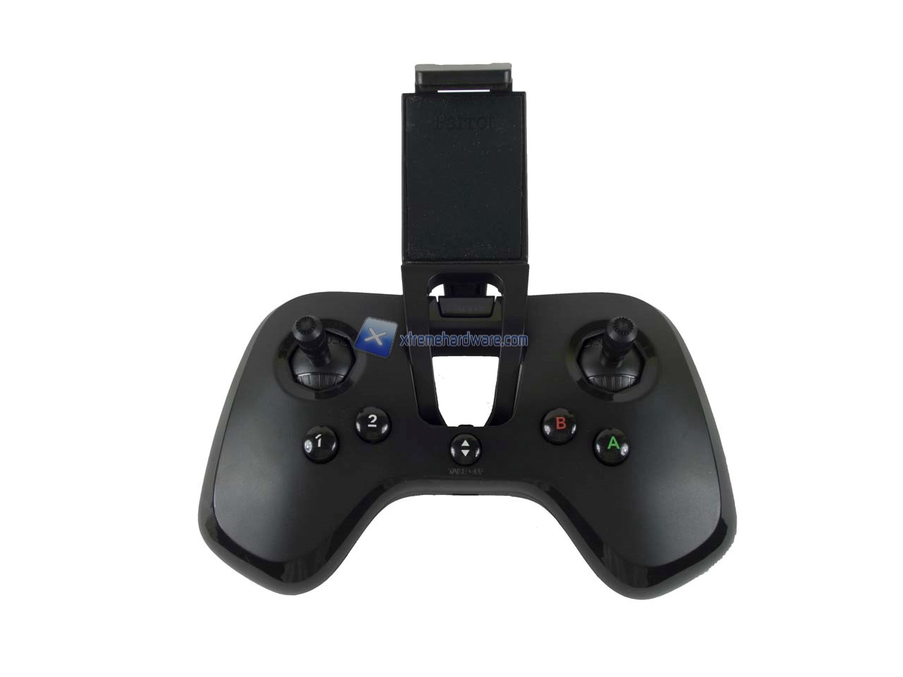 Nella confezione del Parrot Flypad trovremo anche il supporto in plastica per poter alloggiare saldamente il nostro smartphone. Un supporto in plastica con base gommata e regolazione a molla. Potremo impiegare smartphone con dimensioni massime di 160 x 78 x 9,8 mm.