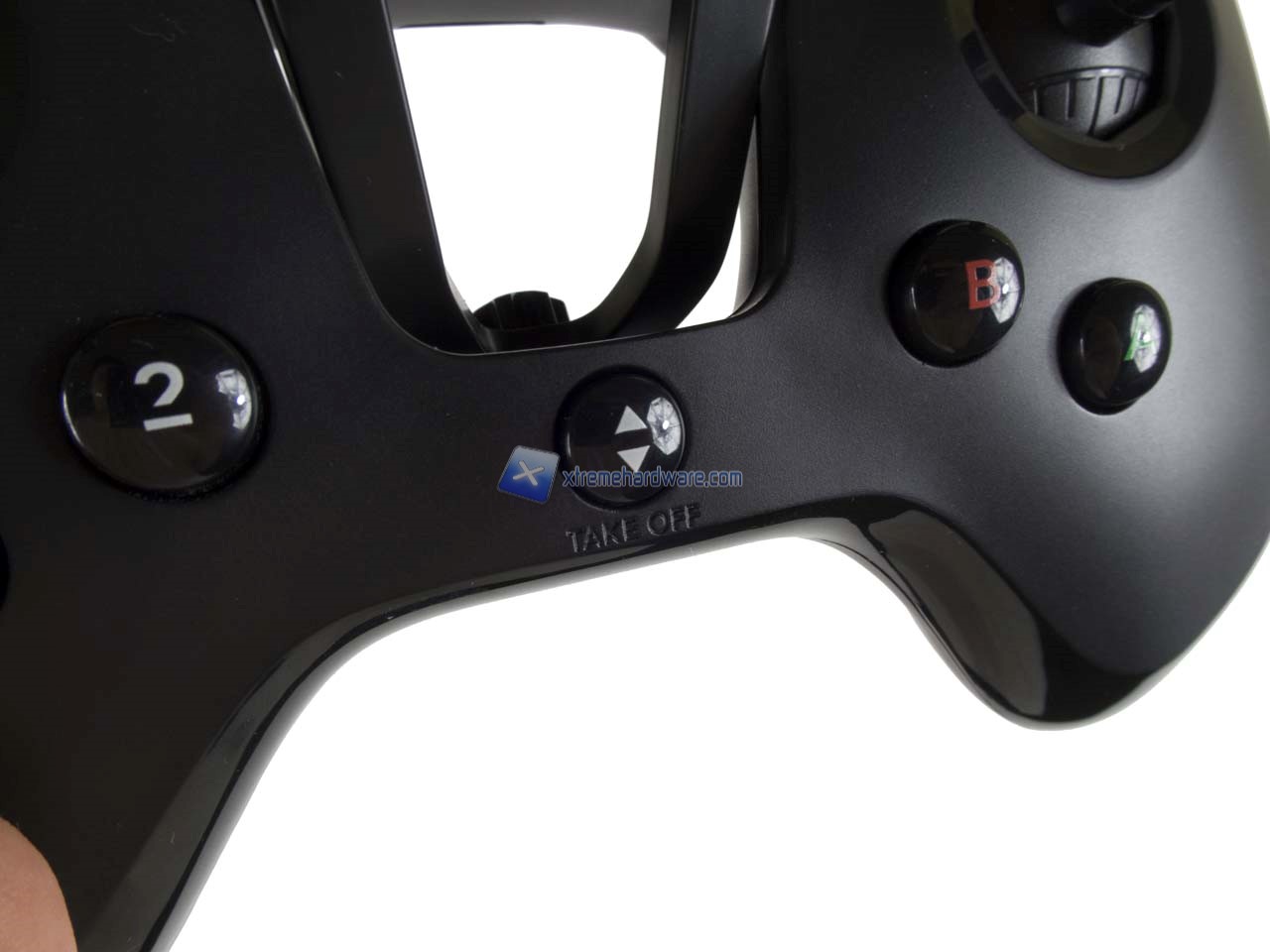 Dettaglio tasto Take Off il quale ci permetterà di avviare con una rotazione minima le eliche dello Swing per poterlo poi lanciare in aria e avviarlo alla massima velocità o farlo atterrare delicatamente al suolo.